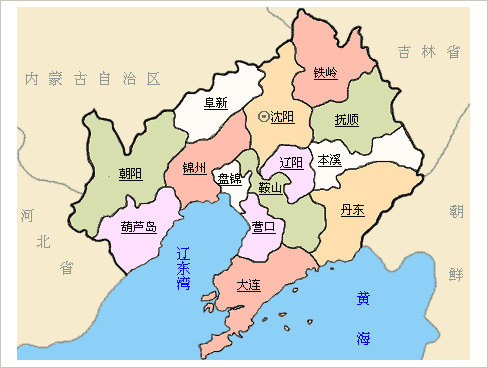位于东北南部,东经118°53'~125°46',北纬38°43'~43°26',面积14.59万平方公里,海岸线2100多公里。 |